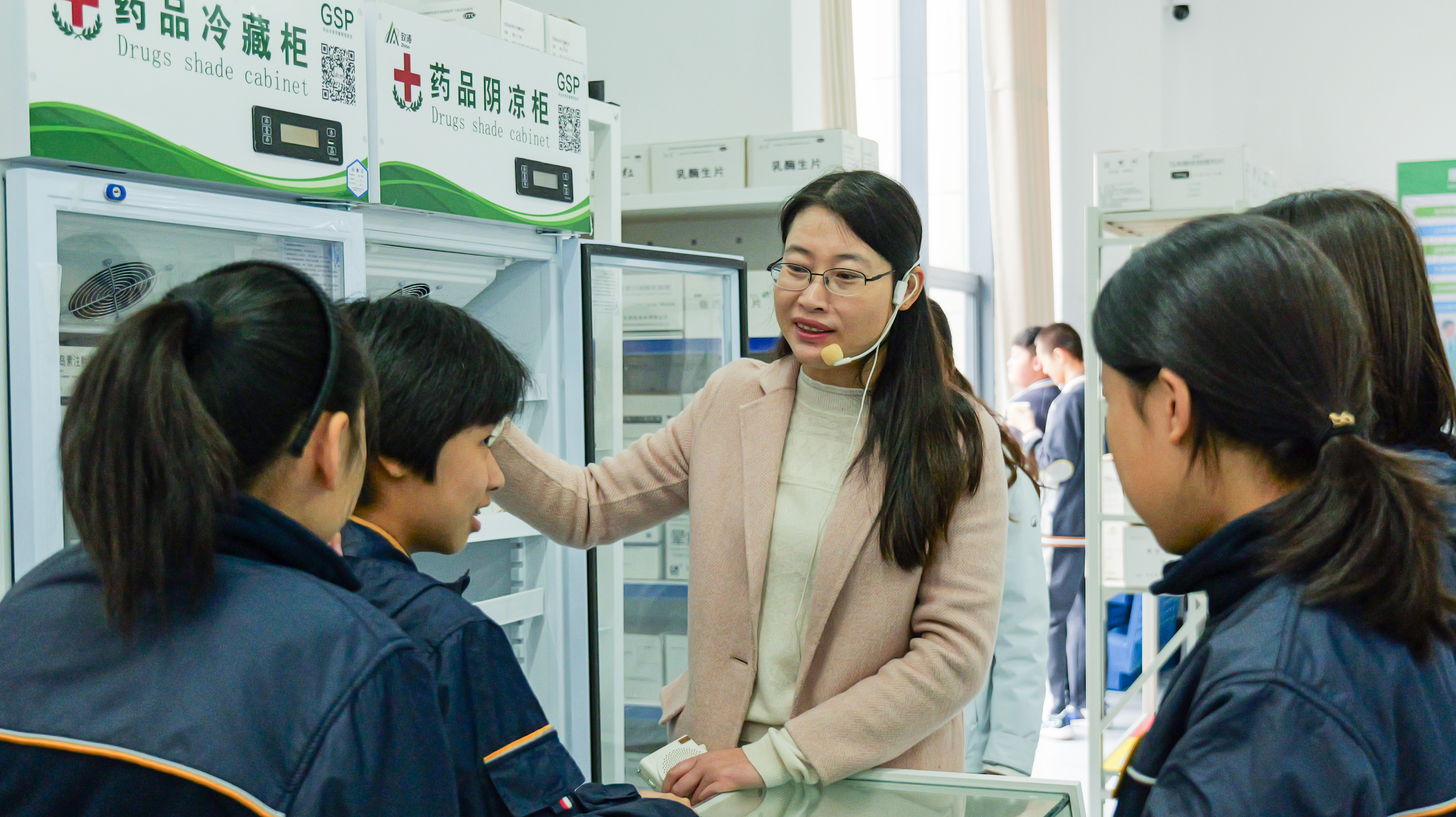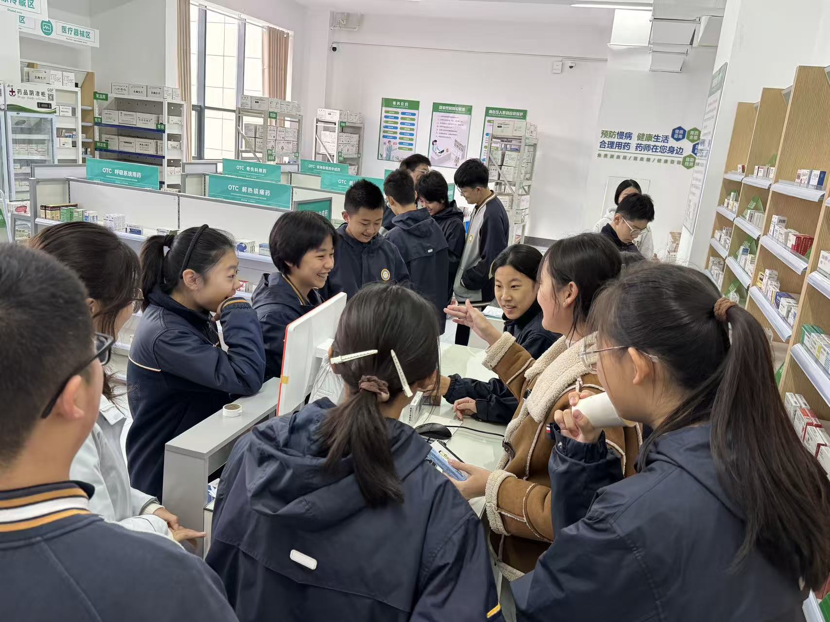 在模拟药房区域,研学活动进入了互动高潮。同学们化身“小小药剂师”,亲身体验了从审方、调配到扫码“卖药”的全流程。这套高度仿真的实践操作,让课本上枯燥的理论知识瞬间变得生动可感。同学们在“玩”中学,在学中“做”,不仅了解了药品管理的严谨性,更对药学工作者的职业内涵有了初步的认知。